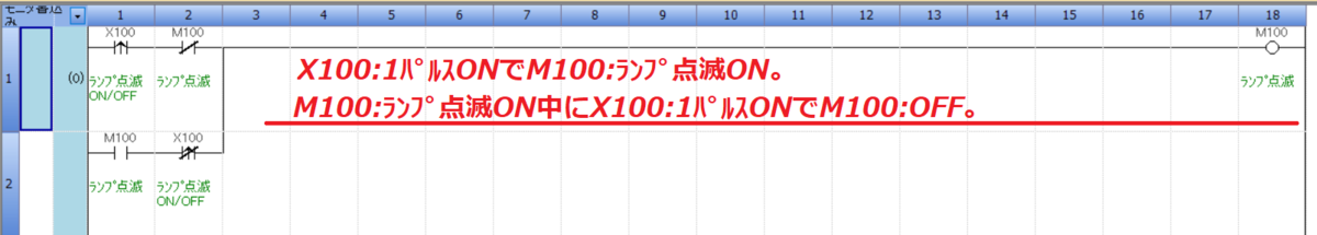 手順1:X100が1回押されたらフリッカー開始手順2:1.0秒ランプのY100が点灯する